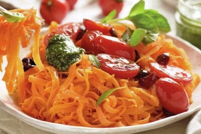 Fideos de calabaza con pesto y espaguetis con tomates cherry