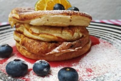 Panqueques de yogur con limón y arándanos dulces y ácidos hechos con…