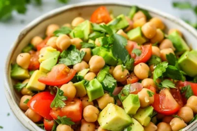 Una ensalada o guarnición abundante y saludable hecha con garbanzos, verduras y…